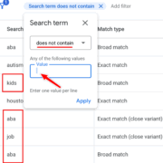 If a search term does not contain something crucial to the success of our account, such as “aba,” filtering that out leaves you with everything that could be wasteful or irrelevant.