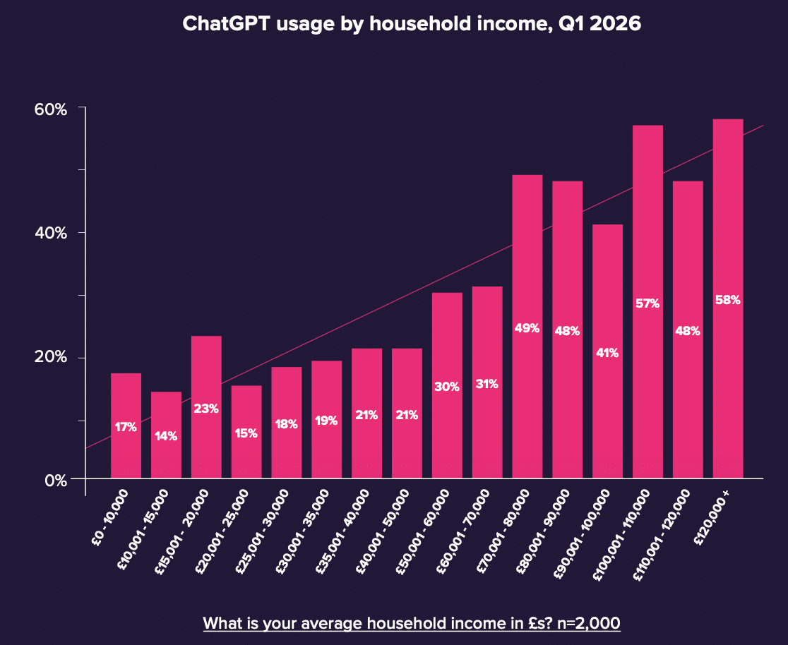 - £50-60k households: ~30% usage (average household income in the UK fits into this bracket based on fiscal year ending 2024)