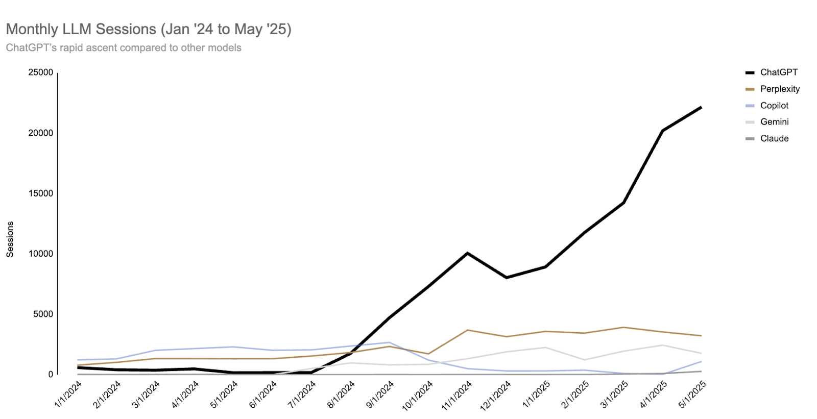 In one standout example, ChatGPT went from just 600 visits/month in early 2024 to over 22,000/month by May 2025.