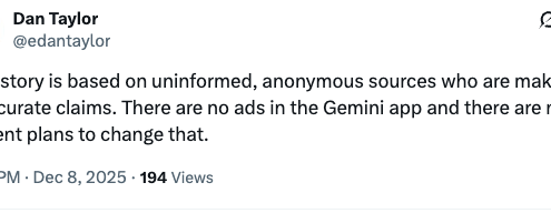 Google Disputes Report Claiming Ads Are Coming To Gemini In 2026 via @sejournal, @MattGSouthern
