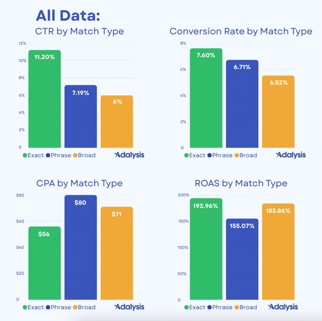 - Phrase match is the problem child. Despite decent conversion rates, it often underperforms on CPA and ROAS because Google applies weaker bidding signals compared to broad.