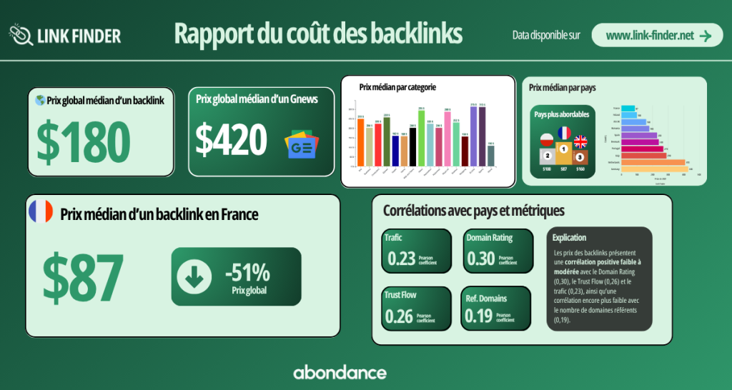 - Le prix médian d’un backlink en France est le plus bas d’Europe (87 €).