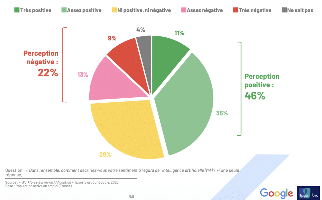 L’image de l’IA s’est améliorée. Près d’un salarié sur deux (46 %) en a désormais une perception positive, contre seulement 22 % qui restent dans une posture négative.