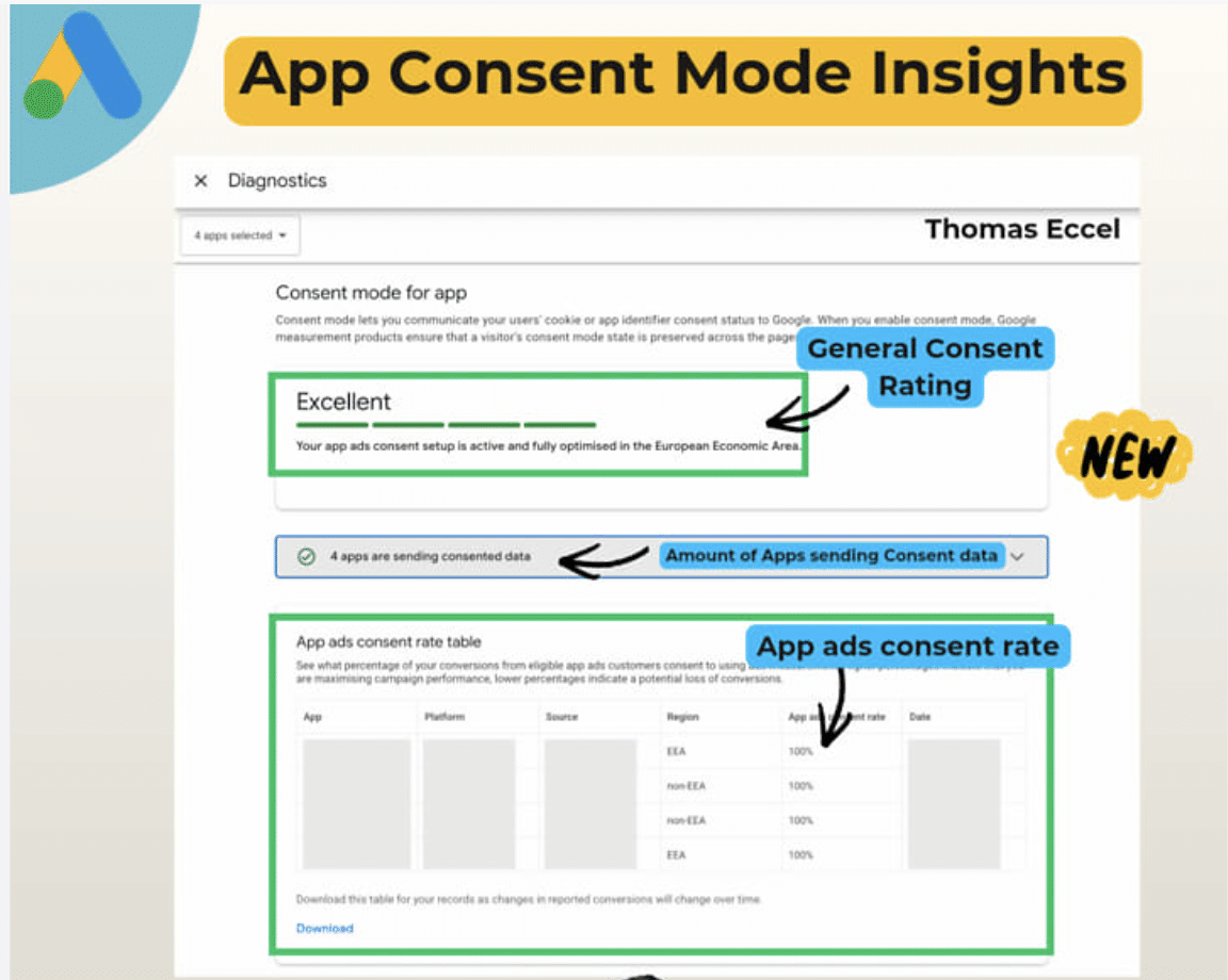 Zoom in. Advertisers can see an overall consent rating — like “Excellent,” “Good,” or “Poor” — alongside a live count of apps actively sending consented data. A detailed table also shows consent rates for conversions, including splits between EEA and non-EEA users.
