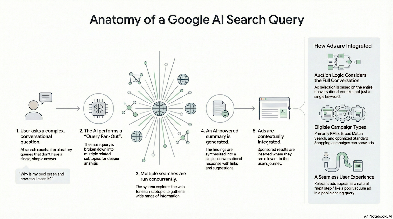 Google’s AI uses a technique called “query fan out,” splitting a complex question into subtopics and running multiple concurrent searches to build a comprehensive response.