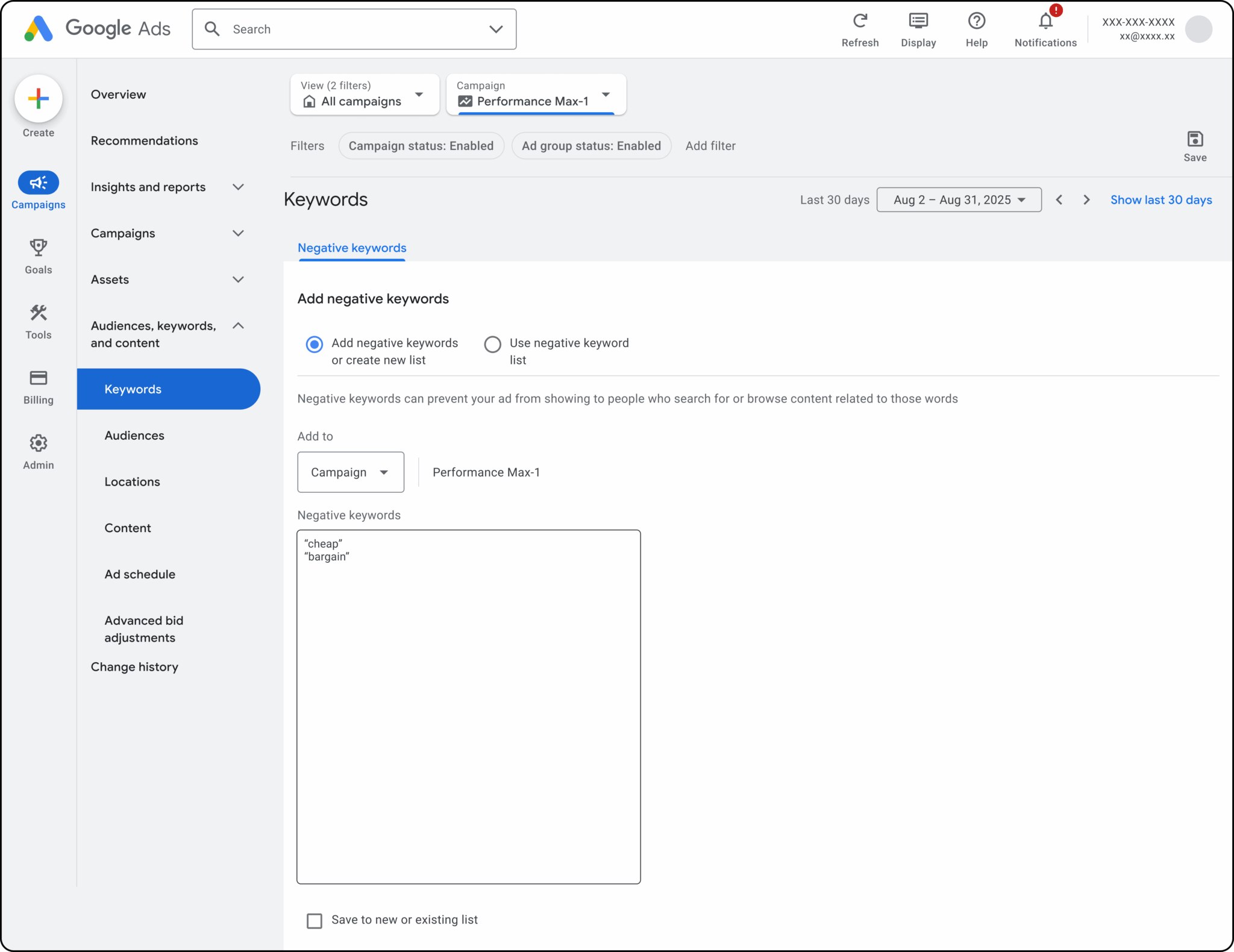 Sharper targeting tools. Campaign-level negative keyword lists are now live, allowing bulk management across multiple PMax campaigns – good for protecting brand suitability at scale.