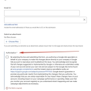 Here’s what’s happening. Users are first routed to a beta AI chat. If they opt to submit a support form instead, they must tick an “Authorisation” box. The wording allows a Google Ads specialist, on behalf of the company, to reproduce and troubleshoot issues by making changes directly in the account.