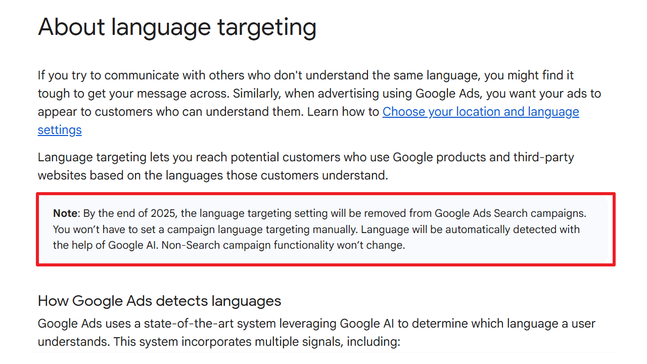 - What’s changing. Manual language targeting in Search campaigns will disappear; AI handles it automatically.