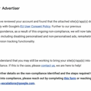 - “We have reviewed your account and found that the attached site(s)/app(s) do not comply with Google’s EU User Consent Policy… we will now take action including disabling personalised and non-personalised ads, remarketing and conversion tracking functionality.”