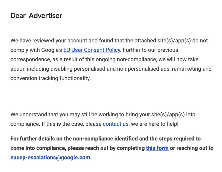 - “We have reviewed your account and found that the attached site(s)/app(s) do not comply with Google’s EU User Consent Policy… we will now take action including disabling personalised and non-personalised ads, remarketing and conversion tracking functionality.”