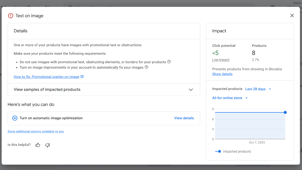 - It surfaces recommended actions, business impact metrics, and sample affected products — giving merchants a clearer sense of what to fix first.