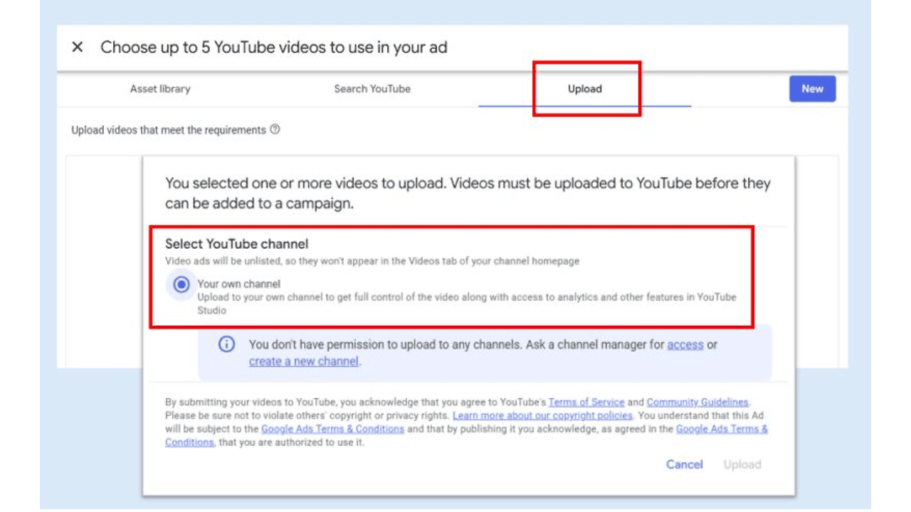 How it works. Uploaded videos are stored in a Google-managed house channel, not the advertiser’s YouTube account.