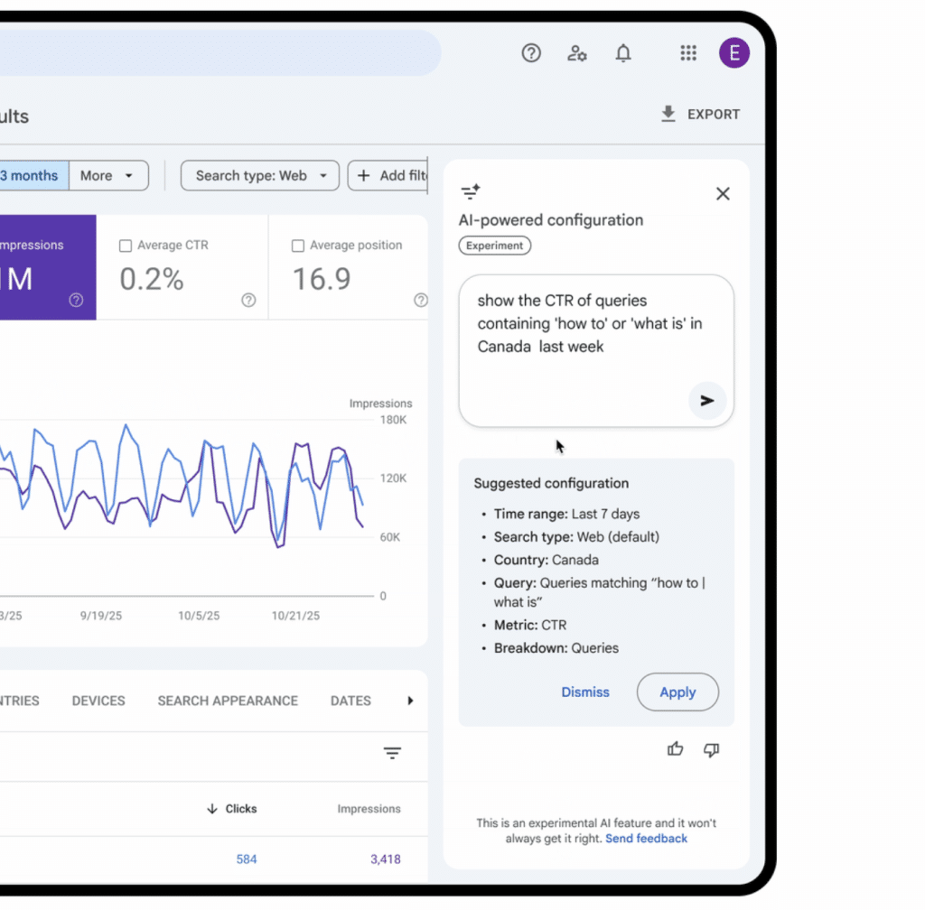 Google généralise sa nouvelle configuration intelligente dans Search Console. Grâce à l’intelligence artificielle, les professionnels du référencement peuvent désormais personnaliser leurs rapports de performances en langage naturel, sans passer par les filtres manuels.