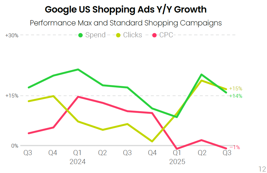 - Shopping ads surged: clicks up 15%, CPCs down 1%, spend up 14%.