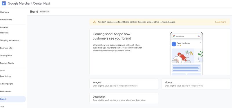 • Appears in the Merchant Center Next “Brand” section, though currently locked from editing.