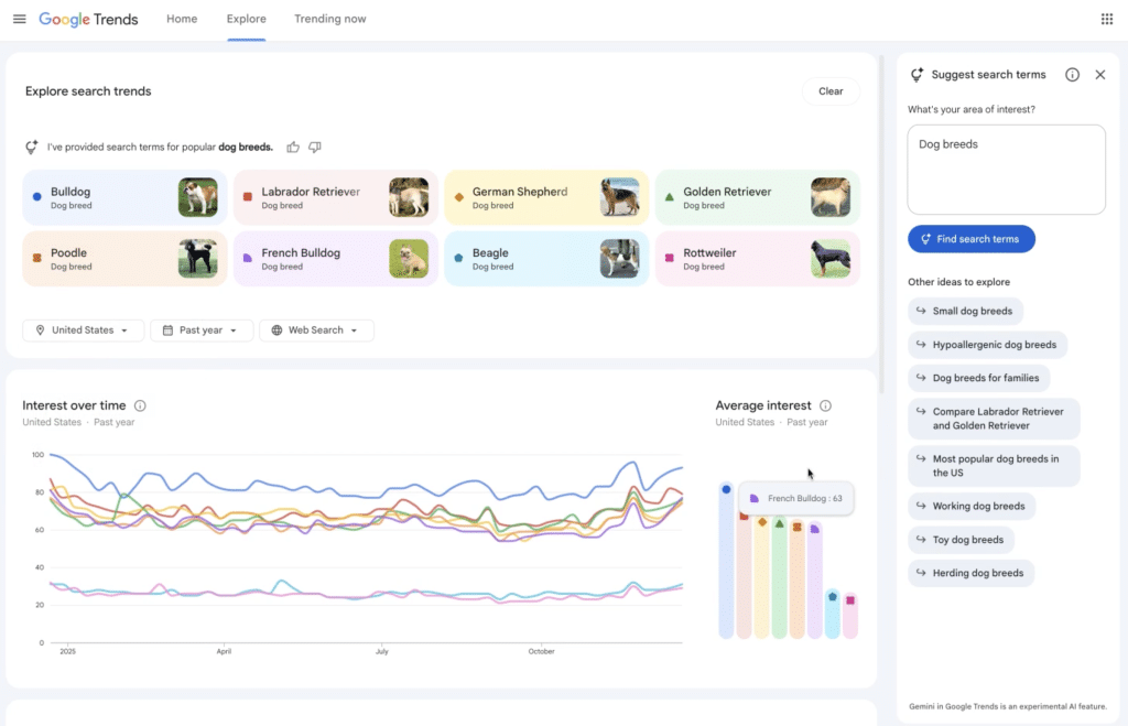 La principale nouveauté réside dans le panneau latéral propulsé par Google Gemini. Lorsque vous recherchez un sujet, l’IA identifie automatiquement les termes associés pertinents et les affiche directement dans le graphique. Par exemple, une recherche sur les races de chiens populaires génère automatiquement des courbes pour « golden retriever », « beagle » et d’autres races tendances.