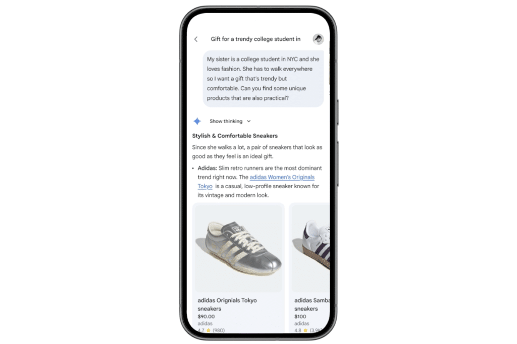 La mise à jour majeure d’AI Mode dans Google Search veut transformer la manière dont vous cherchez des produits en ligne. Fini le temps où vous deviez jongler avec des filtres complexes et trouver les mots-clés parfaits. Vous pouvez maintenant décrire ce que vous cherchez comme si vous parliez à un ami. Par exemple, demander “un pull léger pour mon voyage à Atlanta, intemporel et portable avec des jeans et des robes” suffit pour obtenir des résultats pertinents qui tiennent compte de la météo sans que vous ayez besoin de le préciser.