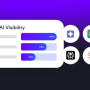 An image with a purple background and a white card titled "AI Visibility" with three progress bars and four circular icons.
