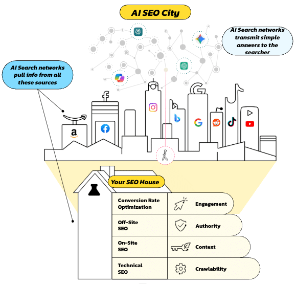 Enter: the AI SEO City. Instead of explaining AI as a series of tools and experiments, imagine your SEO ecosystem as a city.
