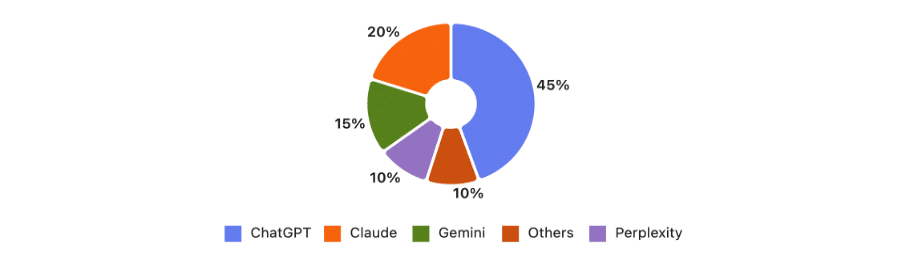 Cette explosion profite en outre à une poignée d’acteurs dominants. Si l’on se concentre sur les assistants conversationnels, hors Google AI Overview (absent en France), ChatGPT s’impose en leader incontesté avec 45 % de part de marché, suivi par Claude (20 %) et Gemini (15 %). Derrière, Perplexity tire son épingle du jeu avec 10 %, tandis que les autres plateformes se partagent les miettes.