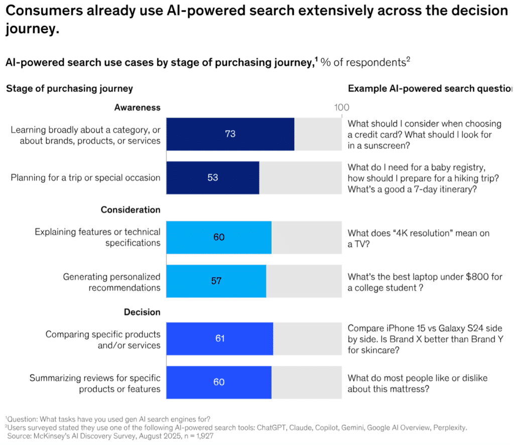 La vitesse d’adoption du GEO est vertigineuse. L’IA générative s’impose déjà comme la nouvelle porte d’entrée du web. Il est donc essentiel de faire évoluer nos pratiques SEO. L’étude McKinsey le confirme : l’IA excelle dans les phases de découverte et de comparaison, ce qui en fait un réflexe quotidien pour de nombreux parcours. Selon cette même étude, 44 % des utilisateurs préfèrent désormais l’IA générative à la recherche classique. Ignorer cette tendance, c’est prendre le risque de disparaître des réponses qui comptent.