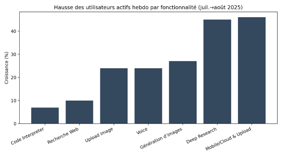 - Les fonctionnalités avancées (Deep Research, Voice) dopent l’engagement : sessions multi-thématiques +60 % plus longues et +74 % de clics.