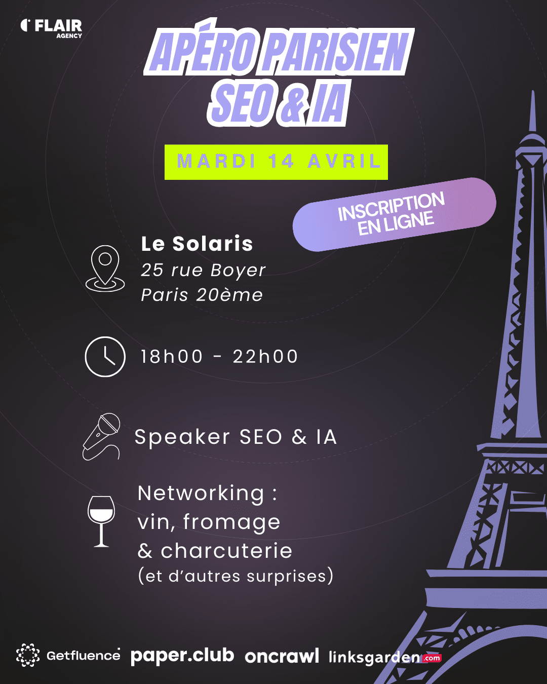 Vous étiez plus de 400 inscrits lors de la première édition de l’Apéro Parisien SEO & IA. Un succès qui n’a laissé à Flair Agency d’autre choix que de proposer une nouvelle édition !