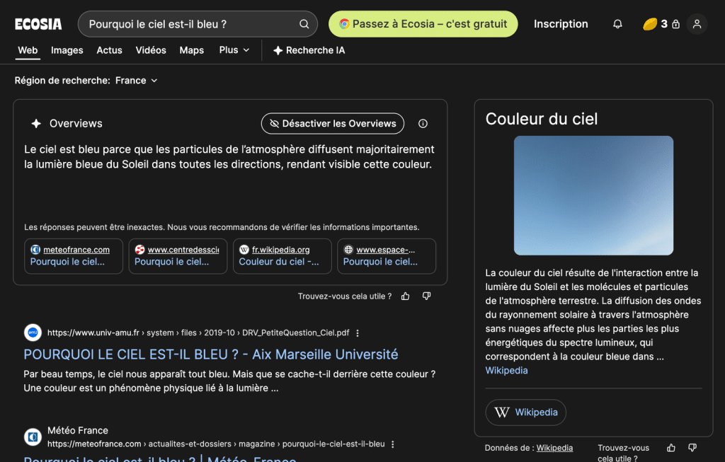 Pour moderniser son interface, Ecosia lance deux outils distincts. Le premier, Ecosia AI Overviews, reprend un concept popularisé par Google : un encadré situé en haut des résultats de recherche qui synthétise la réponse à votre requête. Ce résumé est accompagné de liens sources pour vous permettre de vérifier l’information. Ecosia insiste sur le choix laissé à l’utilisateur : si vous préférez une liste de liens classique, cette fonctionnalité se désactive en un clic.