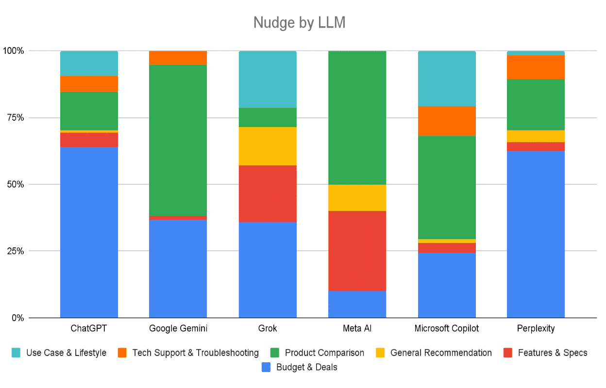 We analyzed how different LLMs use these nudges across prompts and platforms to understand the patterns shaping user behavior — and what they signal for brands trying to stay in control of the journey.