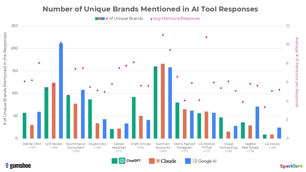 Les résultats montrent une variabilité stupéfiante. Pour chaque prompt testé, le nombre de marques uniques recommandées varie considérablement : de quelques dizaines à plusieurs centaines selon le secteur.