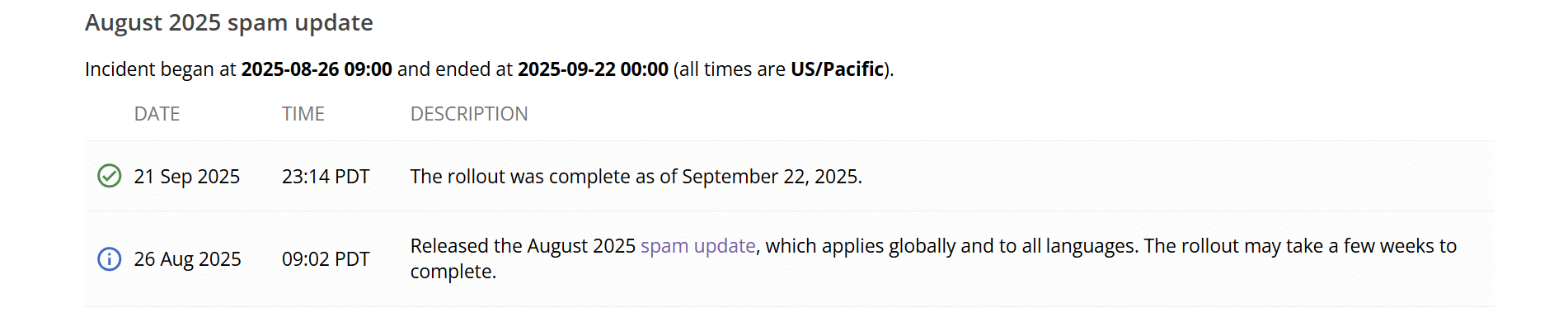 Google a achevé le déploiement de sa mise à jour anti-spam d’août 2025 hier. L’update a duré 27 jours, du 26 août 2025 au 22 septembre 2025.