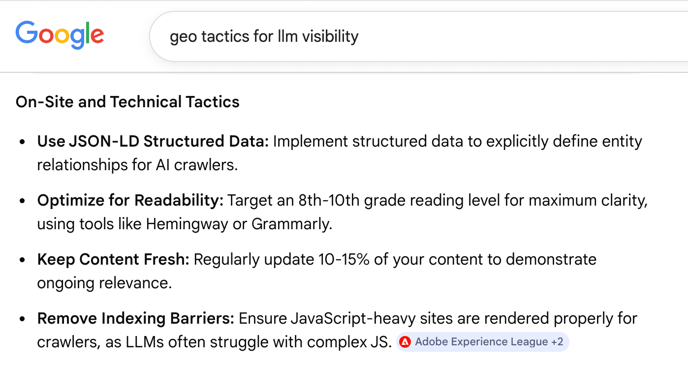 Just search [GEO tactics for LLM visibility], and you’ll see the same tired ideas.
