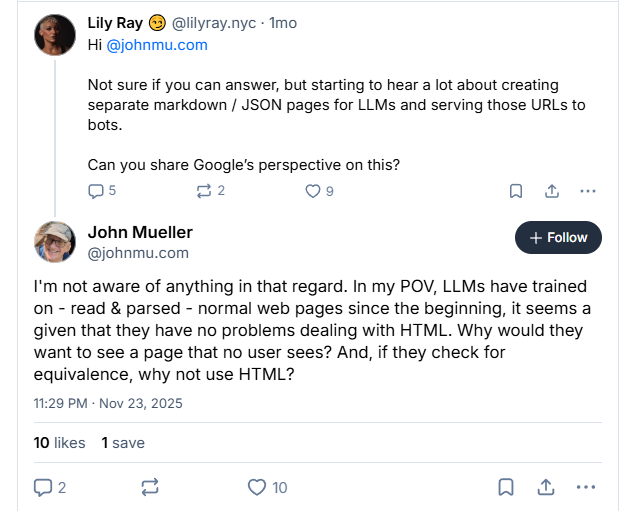 His comparison was blunt: LLM-only pages are like the old keywords meta tag. Available for anyone to use, but ignored by the systems they’re meant to influence.