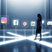 A marketer standing at a futuristic crossroads, with clean glowing signposts representing different social media platforms